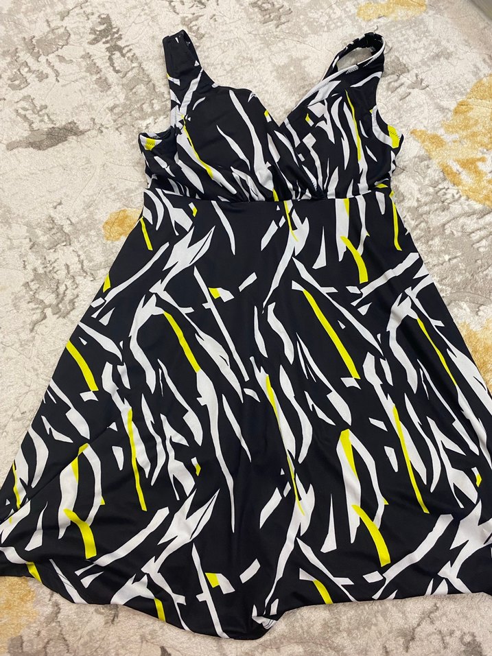 Renkli zebra desenli, drapeli ve uzun kesim, vücuda oturan kadın mayo. Kolsuz ve çağdaş tarza sahip, günlük kullanıma uygun. Lcw den aldım ama hiççç kullanmak nasip olmadı. Üç ay önce aldım beden 44 ama rahat olduğu için 46 48 de olur