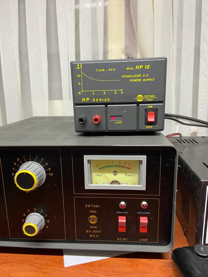Siyah-koyu sarı ZETAGI HP12 müzik sistemi, sabitlenmiş D.C. güç kaynağı, kontrol düğmeleri ve analog wattmetre içerir.