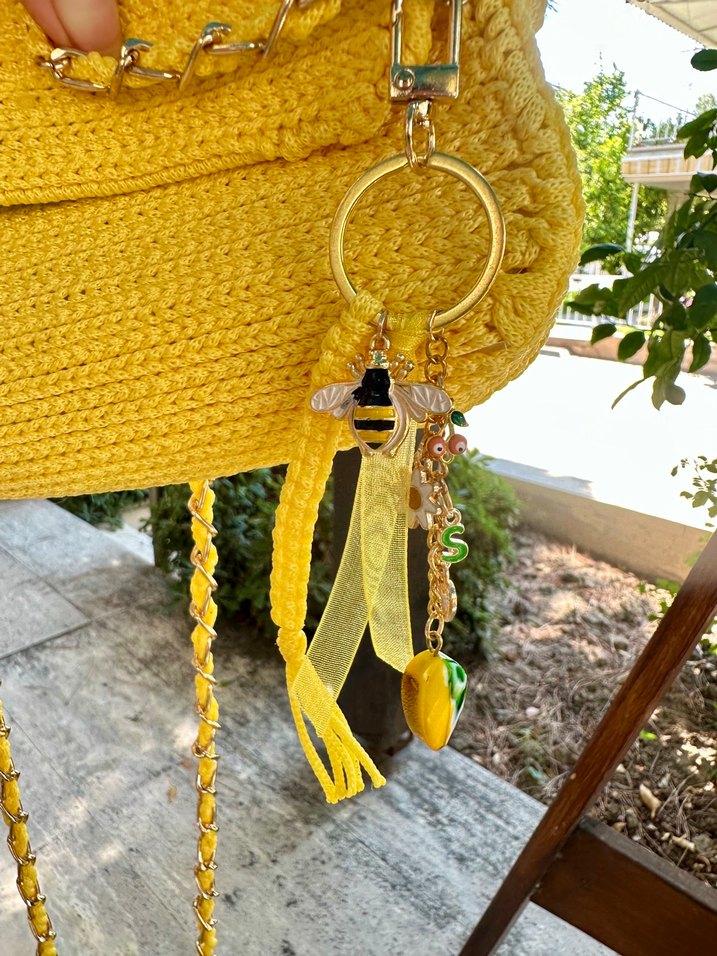 Zincir detaylı sarı anahtarlık, arı figürü, kurdele ve renkli süslemeler içerir.