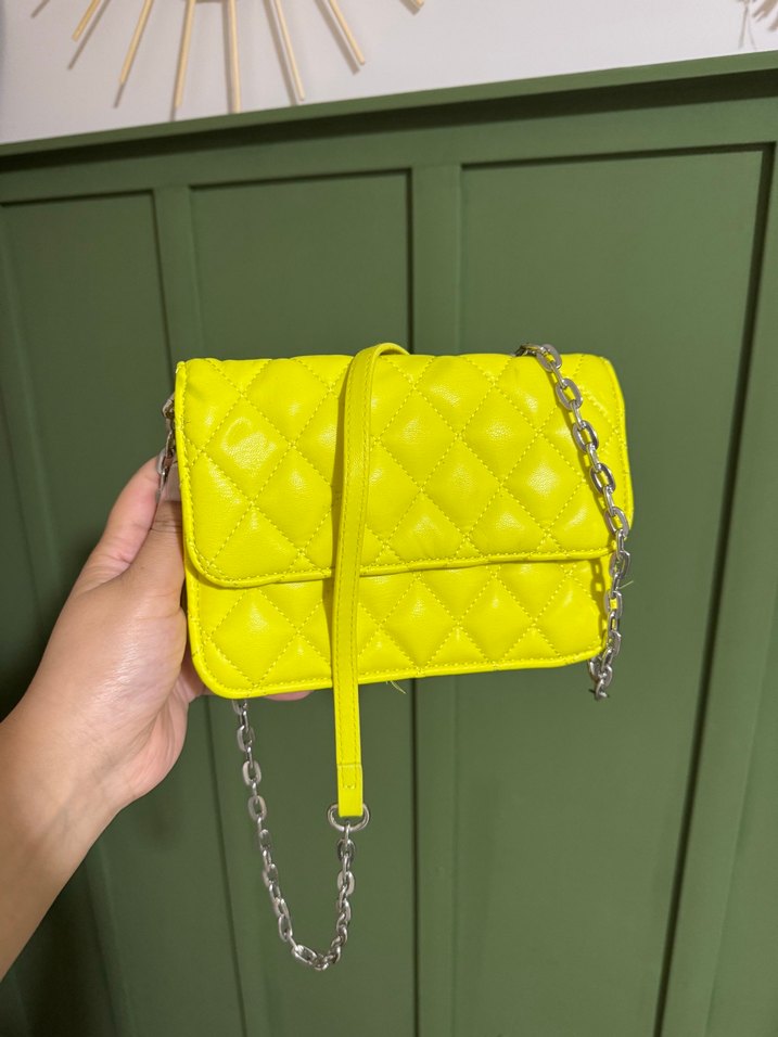 Sarı deri kadın çanta, kareli kapitone desene ve zincir askıya sahip, trend sokak tarzı için uygun.