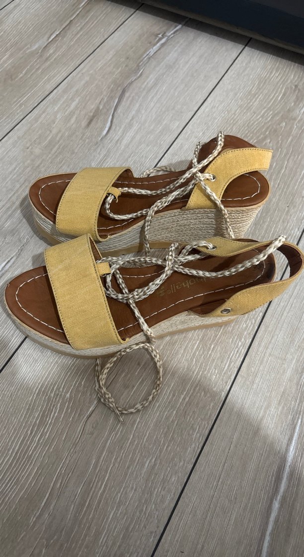 Sarı Zincir Detaylı Dolgu Topuklu Kadın Sandalet