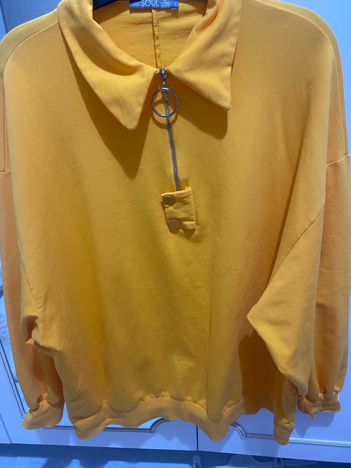 Sarı, zincir detaylı, yakalı ve uzun kollu bol kesim sweatshirt. Normal boyda, yumuşak ve sıcak kumaştan, günlük sokak stili için uygundur. ✨