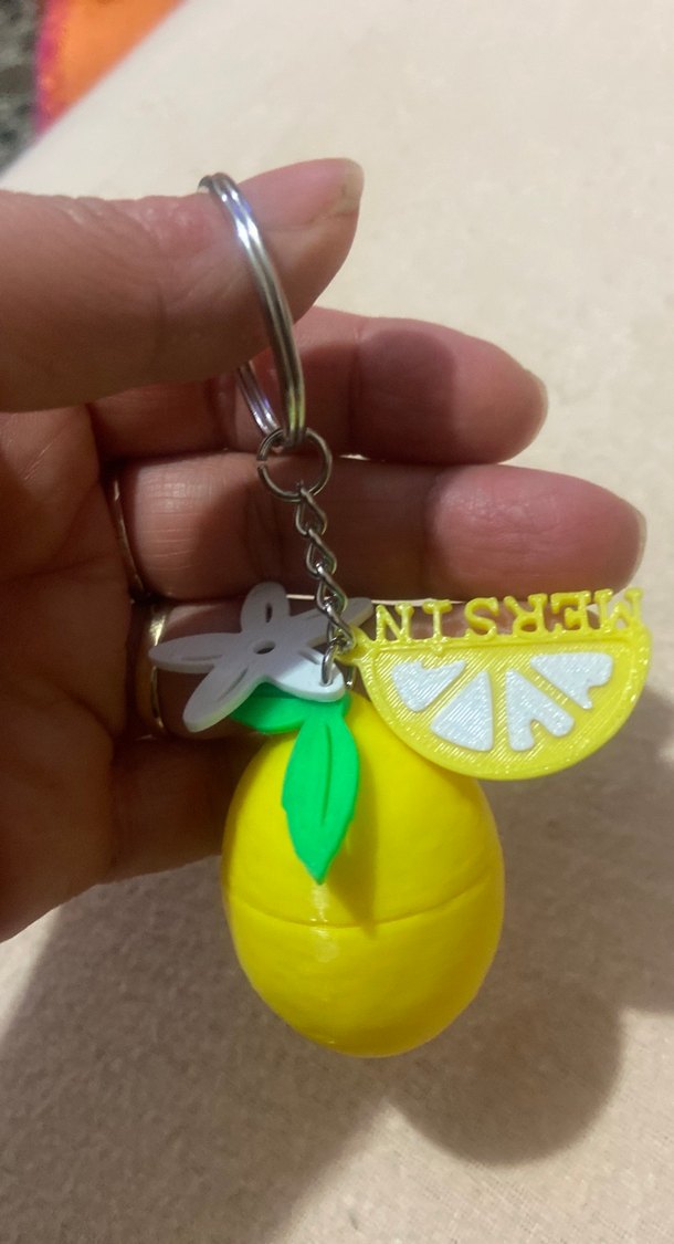 Renkli, zincir detaylı sarı limon ve beyaz çiçek figürlü anahtarlık, rock punk tarzını yansıtıyor.