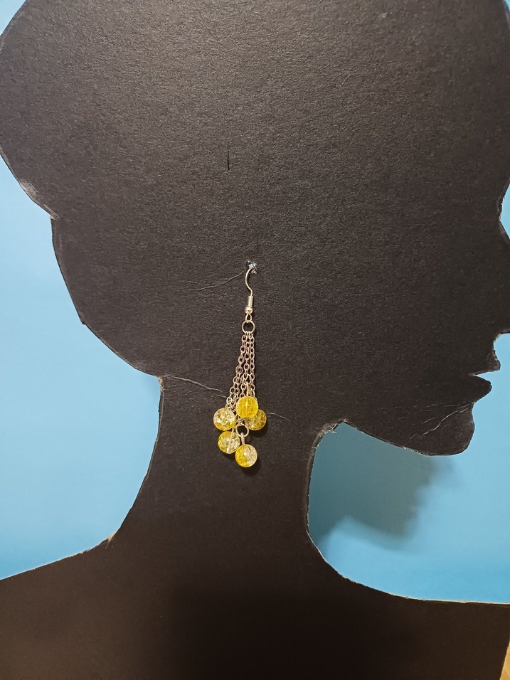 Sarı zincir detaylı, parlak tie-dye desenli boncuklu midi küpe, bohem ve retro tarzları yansıtır, günlük kullanıma uygundur.
