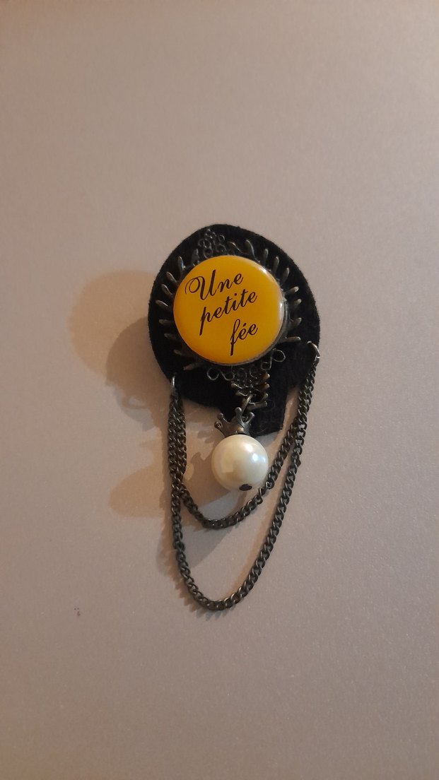 Siyah zemin üzerinde sarı yazılı düğme ve zincir detaylı, incili, Paris esintili rock punk tarzında broş.