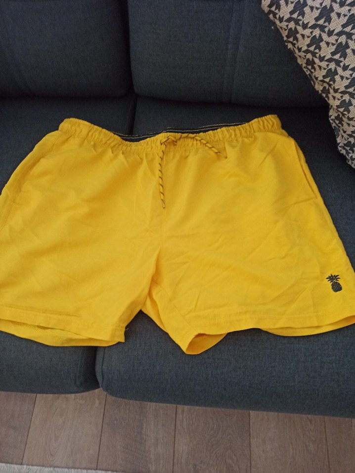 Parlak sarı renk, bol kesimi erkek deniz şortu, plaj ve sokak stiline uygun rahat tasarım.