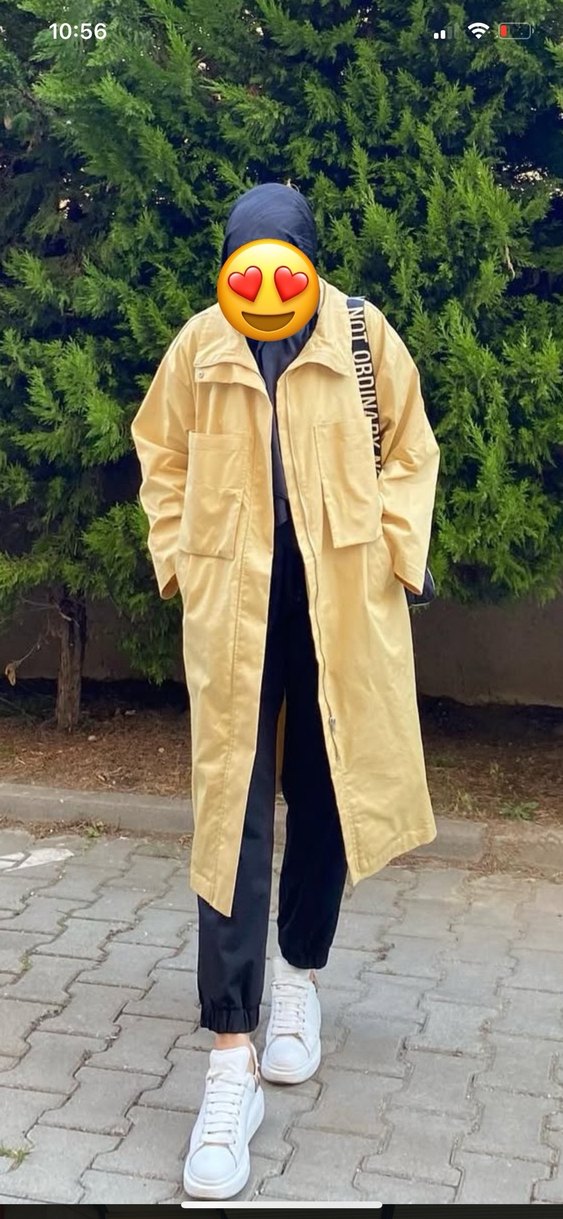 Sarı renkli, kemerli ve uzun kesim kadın trençkot. Bol kesim, uzun kollu ve yaka kısmı açık. Yumuşak ve sıcak kumaştan üretilmiştir.