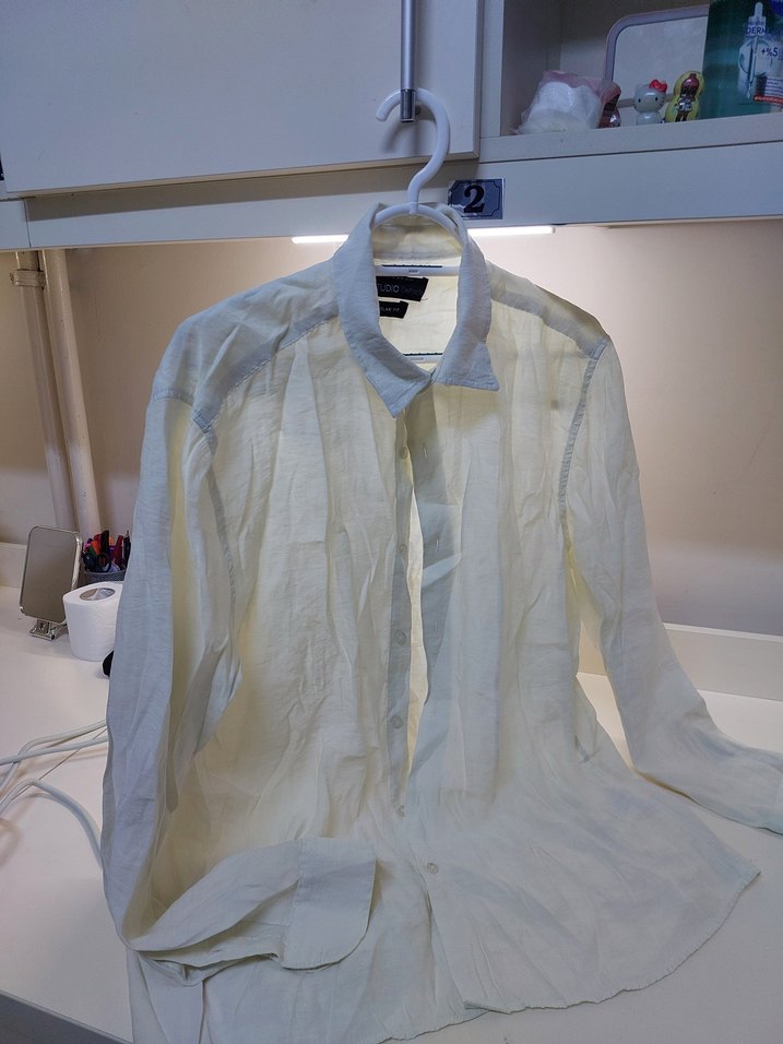 sarımtrak keten kumaştan, düğmeli ve yakalı kadın gömlek. Uzun kollu, bol kesim ve ofis kullanımı için uygun.