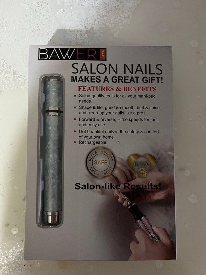 Parlak gri şarjlı tırnak bakım cihazı, evde salon kalitesinde sonuçlar sunar. Tırnakları şekillendirir, törpüler, parlatır ve temizler, ileri-geri fonksiyon ve ayarlanabilir hızlarla kolay kullanım sağlar.