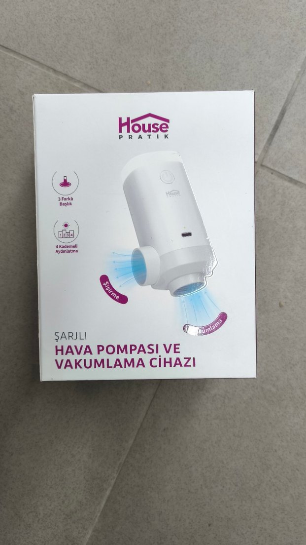 Beyaz renkli, şarjlı hava pompası ve vakumlama cihazı. 3 farklı başlık ve 4 kademeli aydınlatma özelliği bulunur. Kompakt ve kullanımı kolay.