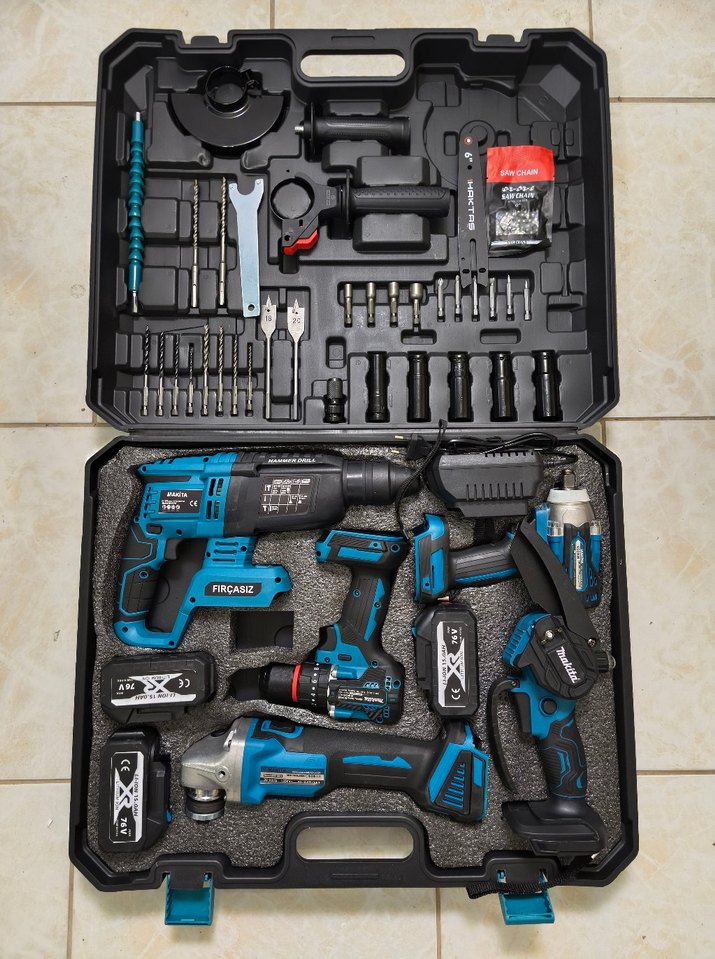 5 makine 3 Batarya (10 Pilli) 1 şarj aleti. 5. Makine şarjlı Testeredir. Zincir boyu 15 cm dir. Fotoğrafta gibi gönderilecektir. Sıfır üründür