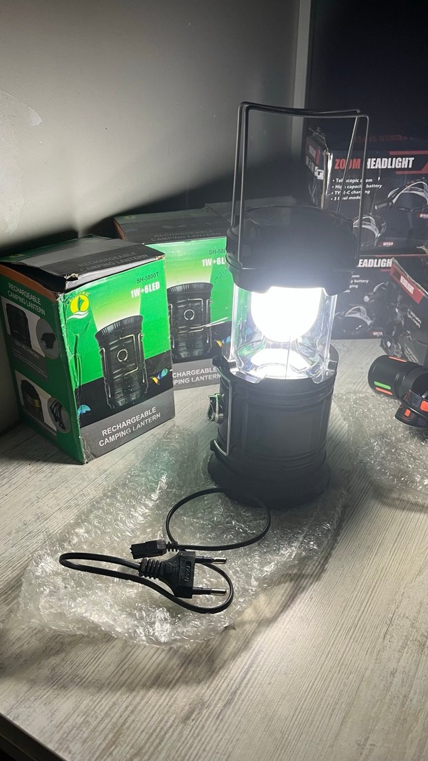 Şarjlı siyah kamp feneri, dayanıklı sap ve parlak LED ışık içerir. Kolay şarj için kablo dahildir. Açık hava kullanımı için uygundur.