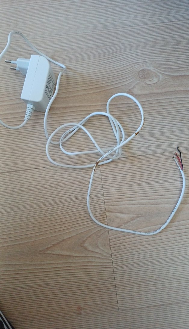 Uzun kablolu beyaz telefon şarj aleti. Kablonun ucu hasar görmüş, iç telleri açıkta. Tamir veya parça için uygun.