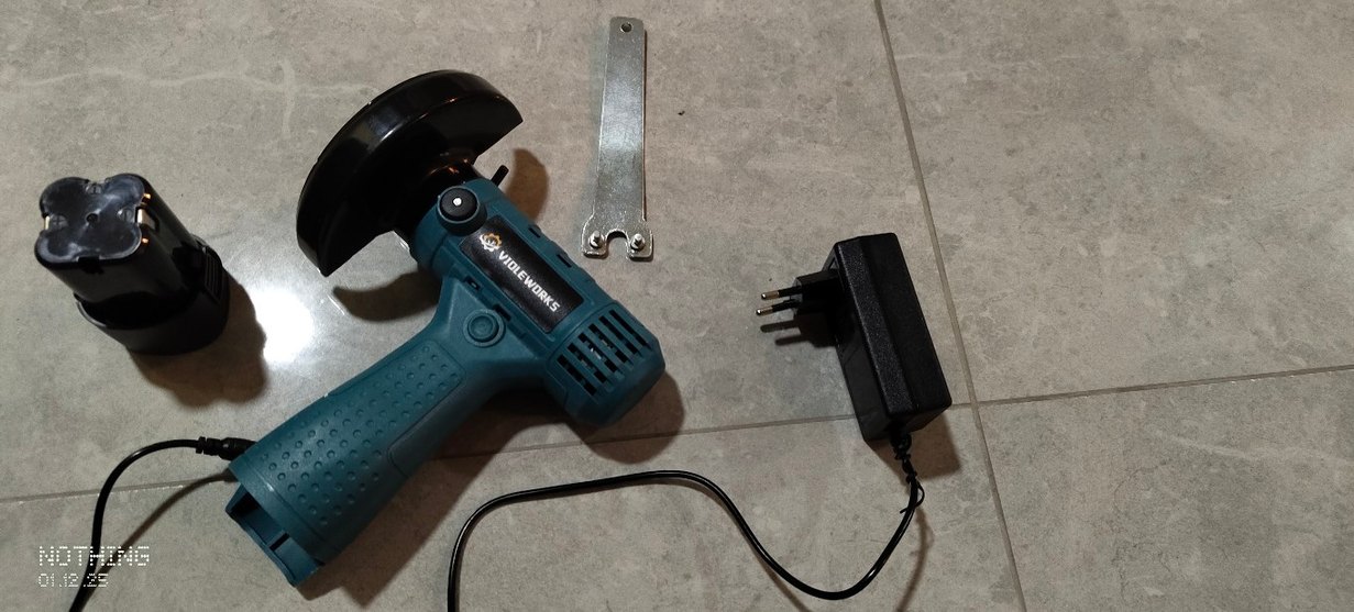 Turkuaz gövdeli Violet Works taslama gri metal anahtar ve siyah güç adaptörü ile birlikte. Küçük kesim işleri için uygundur.