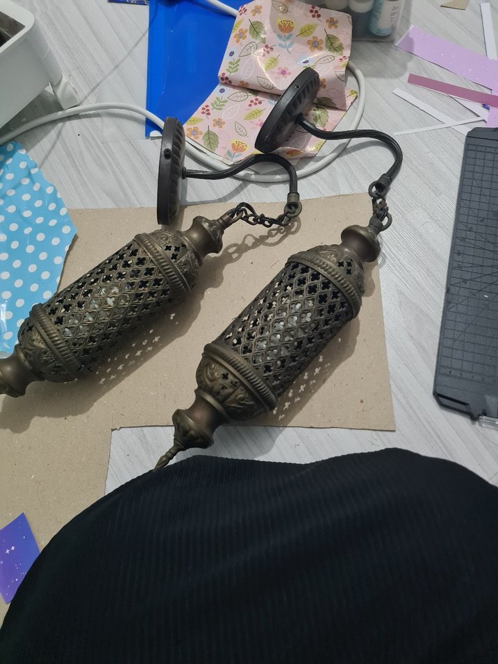 Koyu bej renkli, metalden yapılmış, detaylı kafes desenli sarkıt lambalar. Asılabilir ve vintage bir hava katar. elektrikli