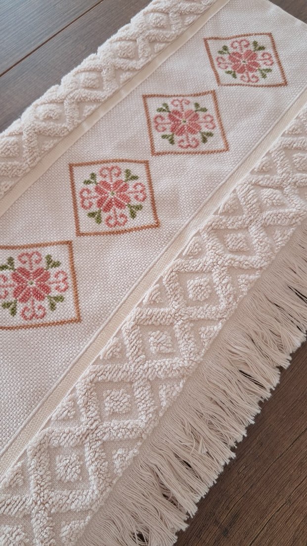 90×50 cm ebatlarında domino iple işlenmiş kaneviçe el işi ceyizlik havlu