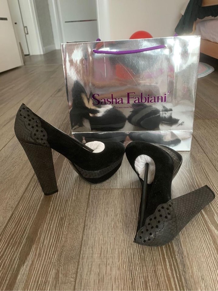 Sasha Fabiani markalı, gerçek deri baskılı detaylı ve siyah platform topuklu stiletto, romantik gece için uygun.