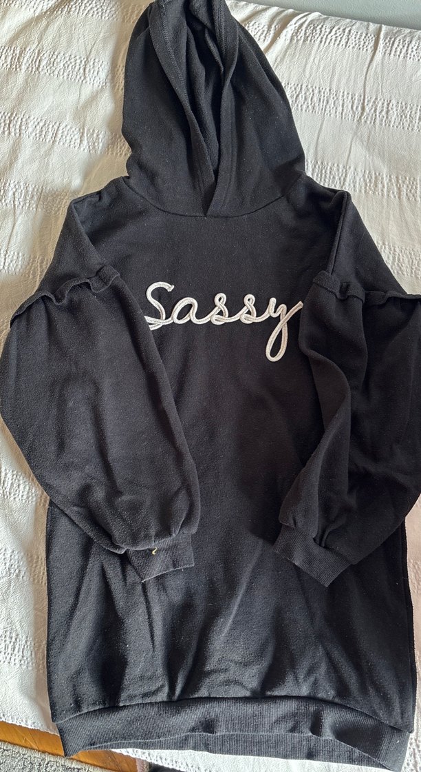 Siyah kapüşonlu sweatshirt, bol kesim uzun kollu ve önünde "Sassy" baskılıdır. Parlak görünümlü, yumuşak ve sıcak kumaştan üretilmiştir.