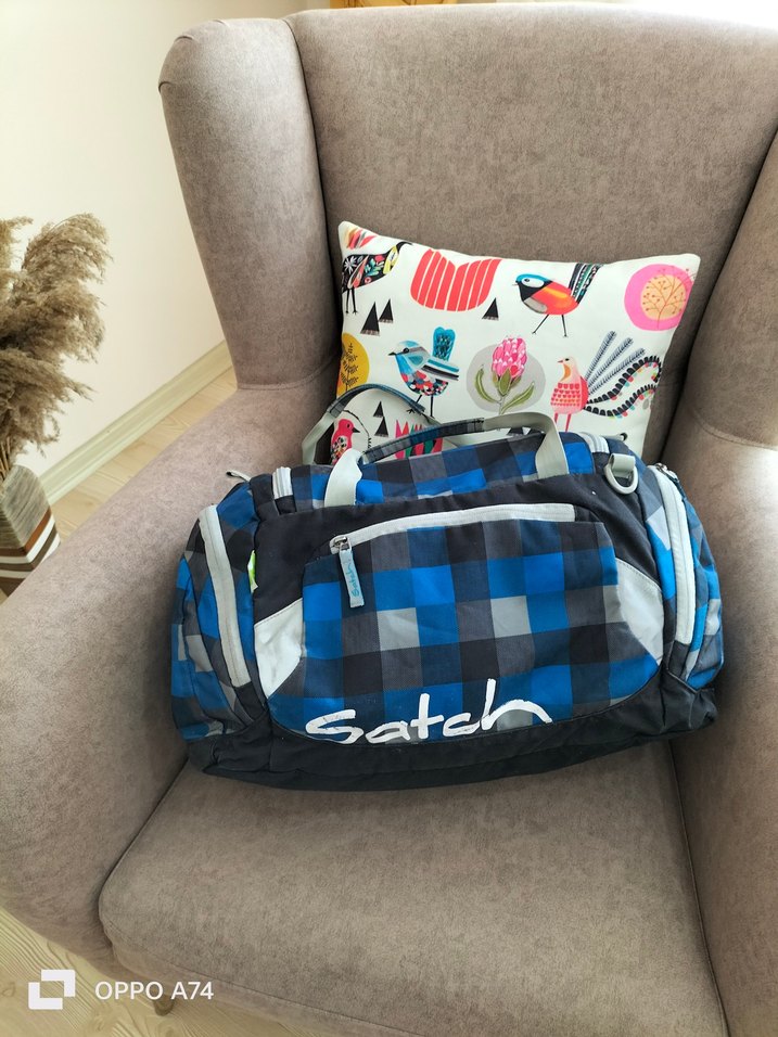 Mavi ve gri kare desenli, önünde 'Satch' yazısı bulunan, çok bölmeli fermuarlı spor çantası
