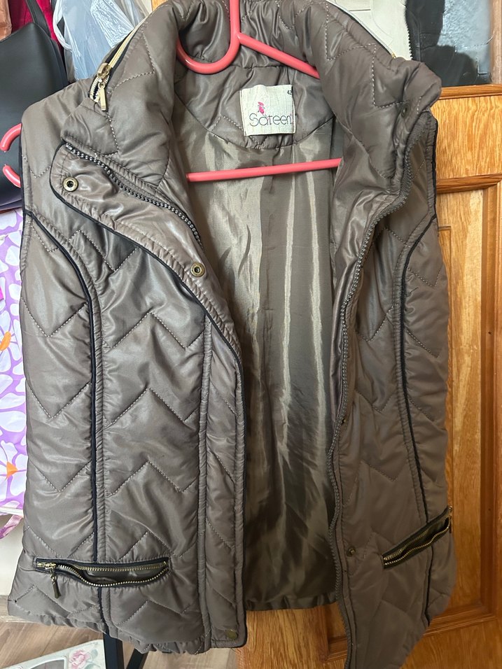 Gri renkte, fermuarlı cepleri ve kesimli yakası olan, sentetik kumaştan yapılmış, rahat ve şık kadın yeleği.