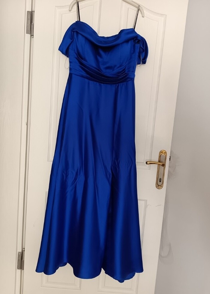 Saten saks mavisi abiye. Sadece bir kez giyildi . Küçük bir kısmında ip çekiği vardır.10 cm topuklu ile giyildi .