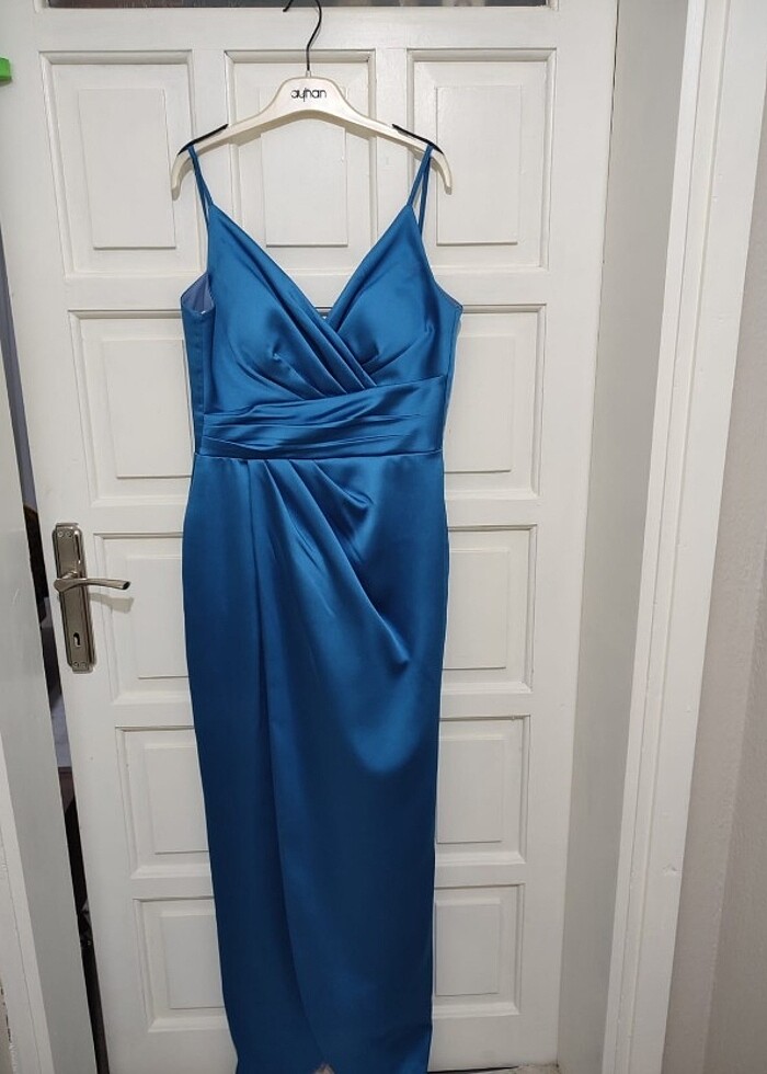 Bir kez giyildi saten Indigo mavi
