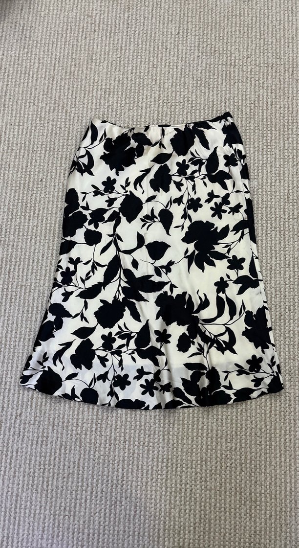Bu uzun hamile eteği, beyaz sentetik kumaş üzerinde koyu çiçek desenli, bol kesim ve piliseli tasarıma sahiptir, bohem ve Paris tarzını yansıtır.