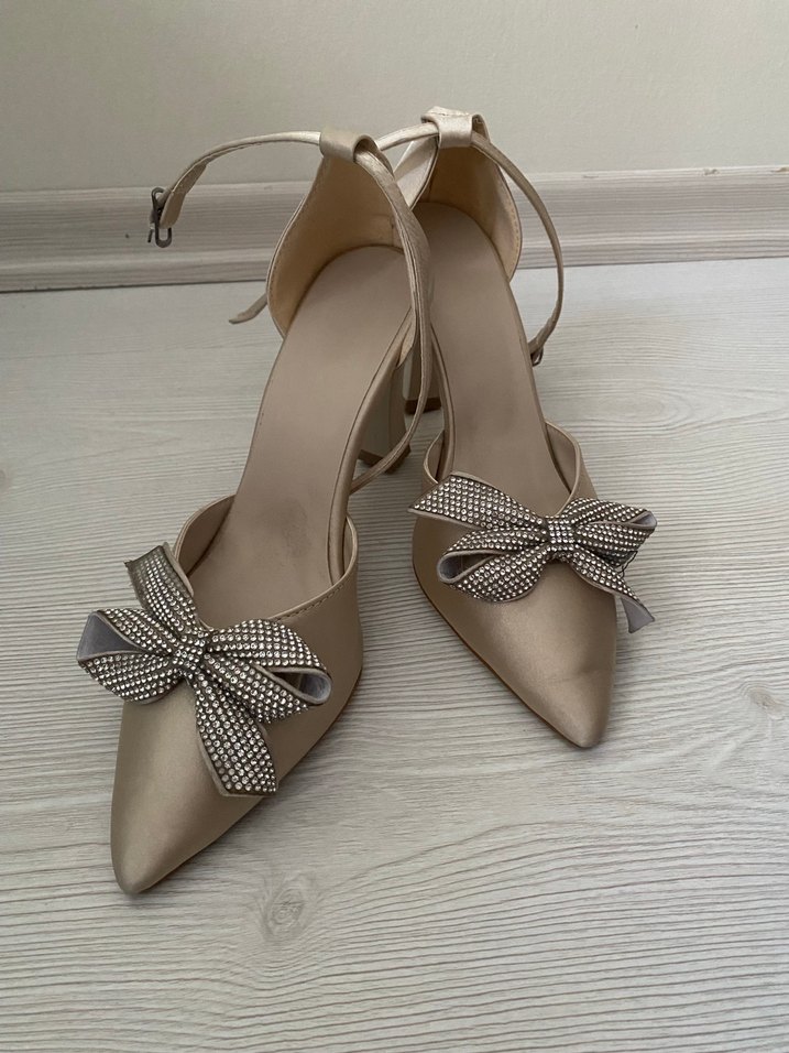 Bej saten yüksek topuklu abiye ayakkabılar, şık bir fiyonk detayı ve bilekten bağlama özelliğiyle düğünler için uygundur. Modern Paris tarzı sunar. Sadece 1 defa giyildi