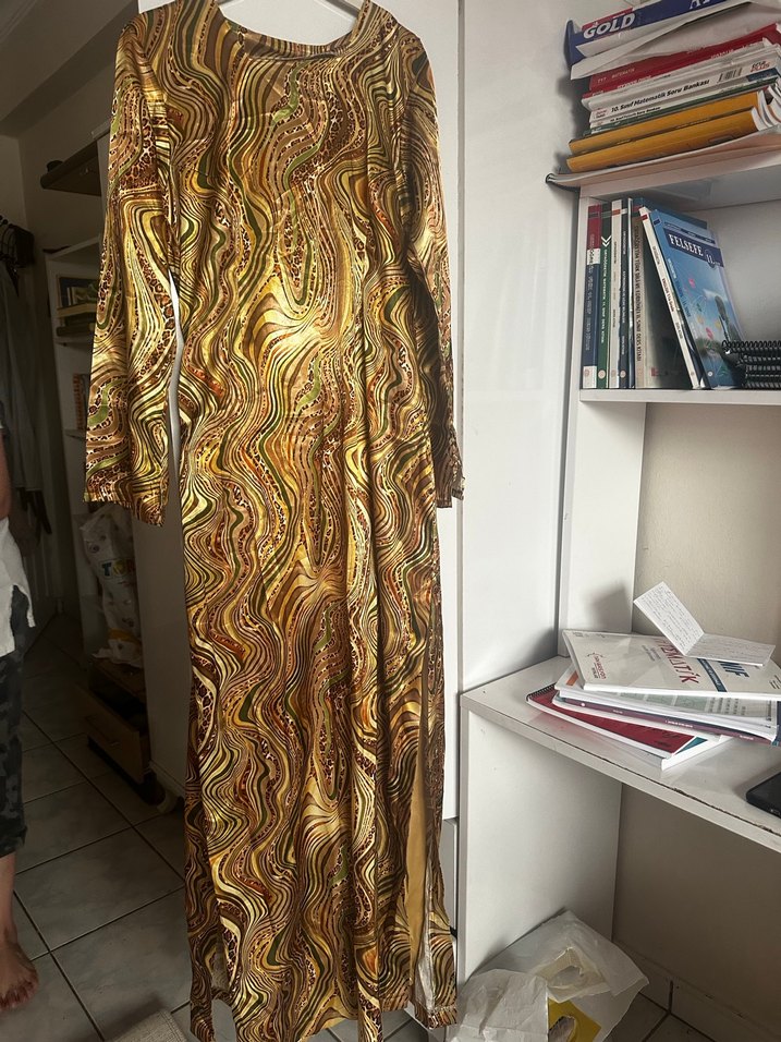 Parlak altın renkli, bohem bağlama desenli, uzun kollu, drapeli, bol kesim ve tekne yaka uzun şalvarlı elbise. İpeksi kumaştan, parti için uygun. ✨ikili üründür .bir defa giyildi