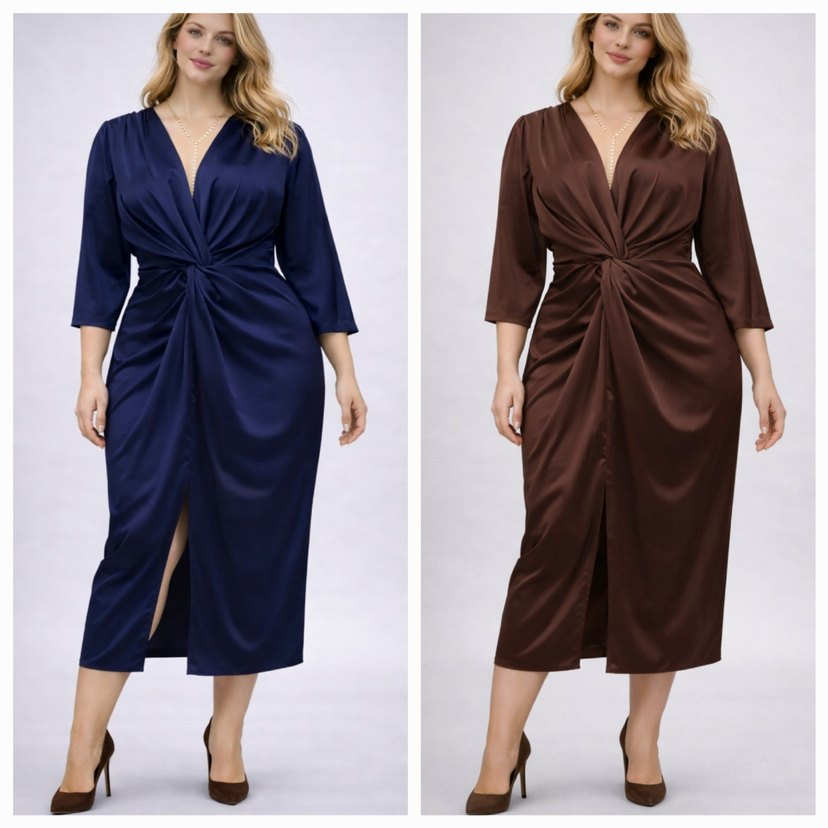 Kahverengi ve lacivert göbek kapatan burgu model elbise A kalite bir kumaş mağaza ürünüdür sıfır etiketli üründür 42-44-46-48 bedene kadar mevcuttur
