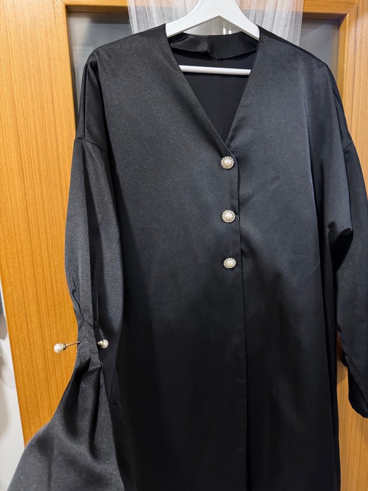 Saten siyah kumaştan, düğmeli ve V yakalı ceket. Özel dikimdir. 42-46 beden uygundur