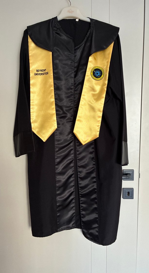 Bu uzun kadın mezuniyet elbisesi, kesikli yaka ve drapeli tasarıma sahiptir. Düzenli kesim ve uzun kolludur. Parlak altın sarısı şal, Beykent Üniversitesi logosunu taşır. ✨