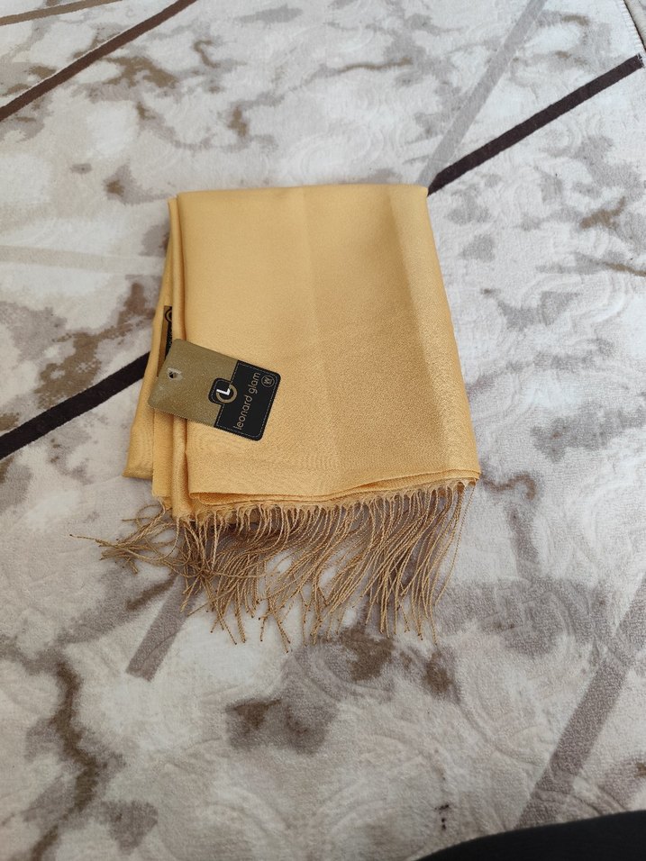 Saten dokulu, parlak bej renkte püsküllü kadın şal. Bohem tarzına uygun, rahat ve retro bir görünüm sağlar.
