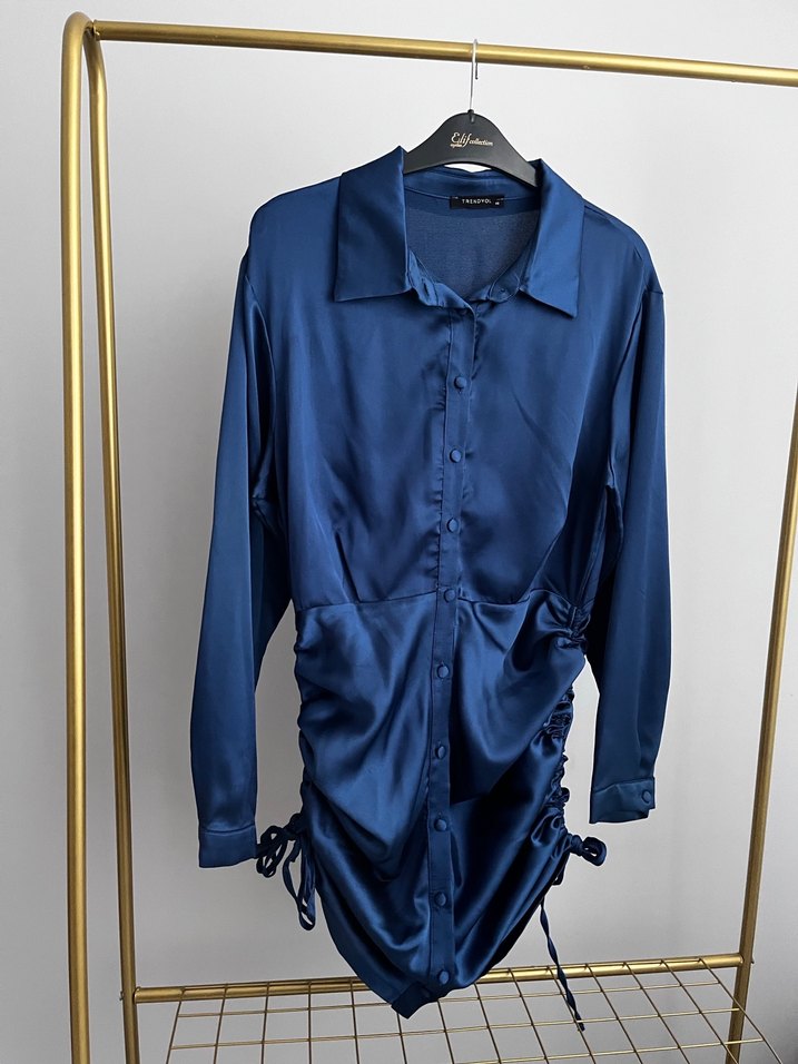 Düğmeli, uzun kollu, yakalı ve saten dokulu gömlek elbise . Midi boyda, yanlarda ayarlanabilir büzgü detaylı, ofis stiline uygun şık bir model.