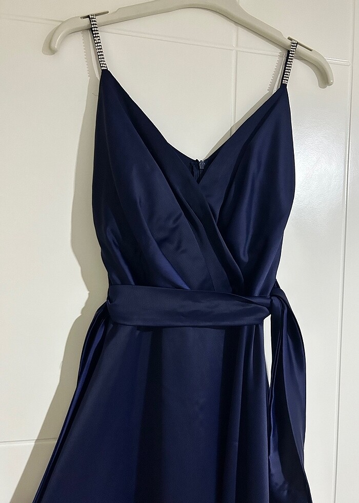 Lacivert saten midi boy elbise bir kere düğünde giydim butik ürünüdür büyük bedendir beli kemeriyle ayarlanıyor benim bedenim xs fakat m beden içinde uygun