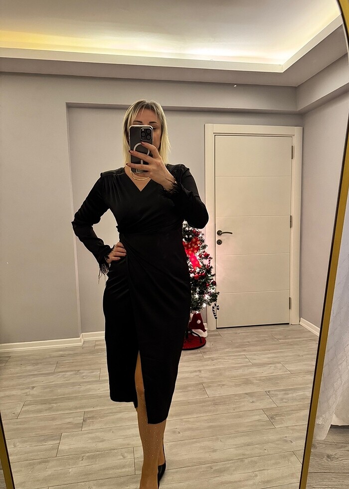 Hiç giyilmedi. Önden çapraz yırtmaçlı midi elbise