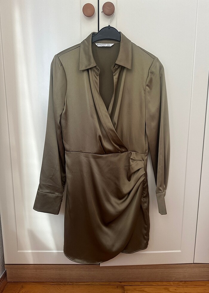 STRADIVARIUS SATEN ELBİSE- yağ yeşili, S beden, yandan fermuarlı. Elbise boyu omuzdan 80 cm