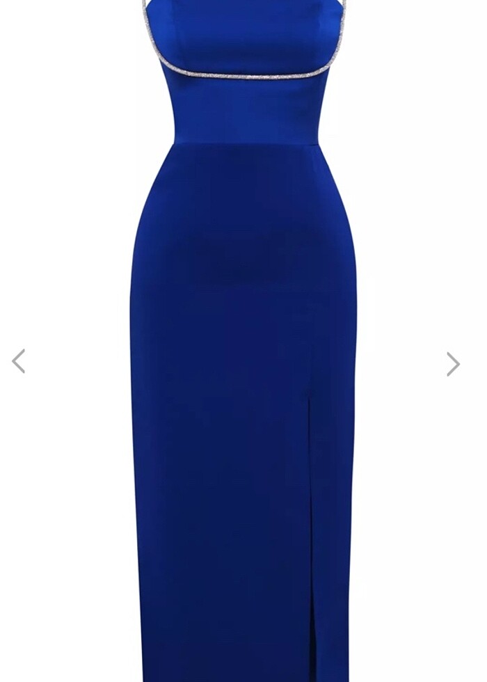 Saks mavisi orta boy derin yırtmaç saten elbise keikei marka