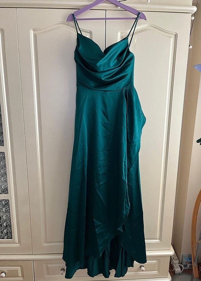 Petrol Yırtmaçlı Saten Elbise bir kere giyildi