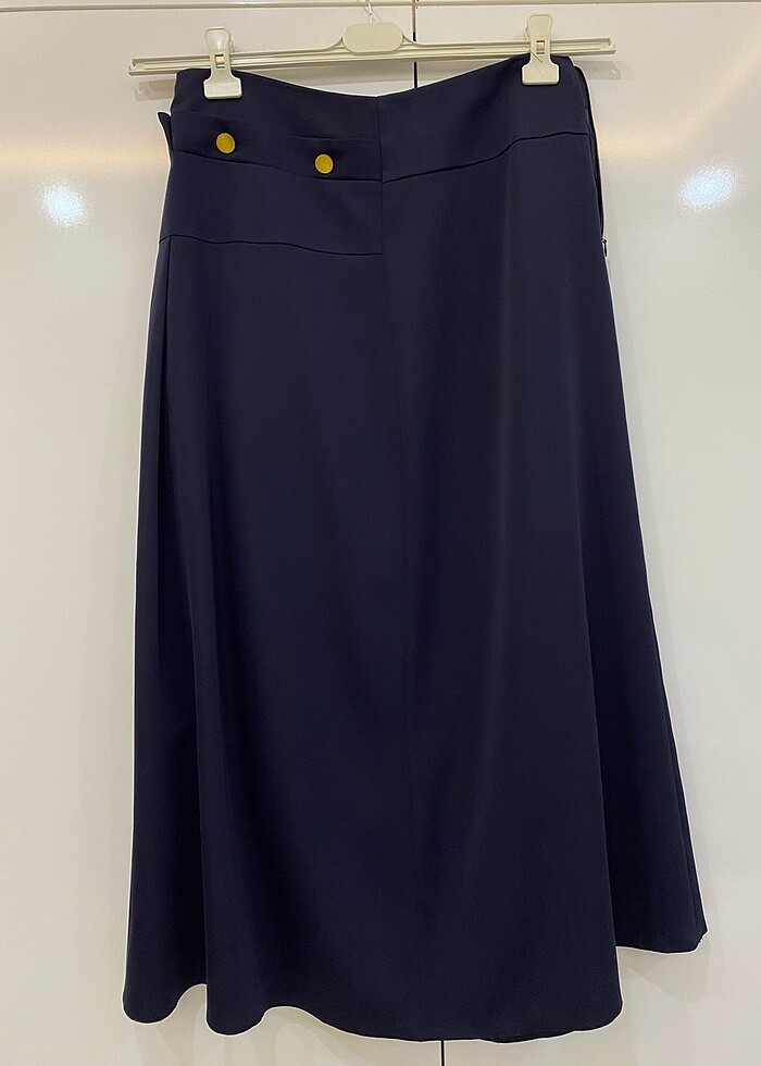 Gold düğme detaylı lacivert saten uzun etek