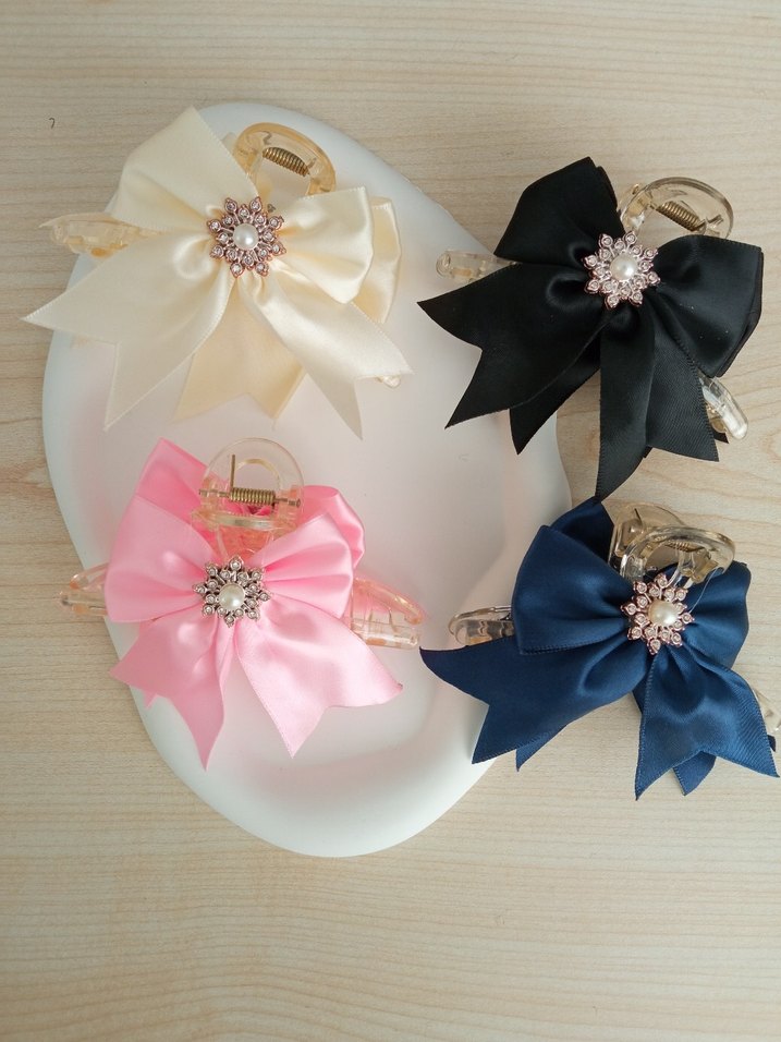 kırem rengi bitti❌ Beyaz, siyah, pembe ve lacivert saten tokalar, ortasında parlak taş detaylı büyük fiyonklarla modern klasik şıklık katıyor.