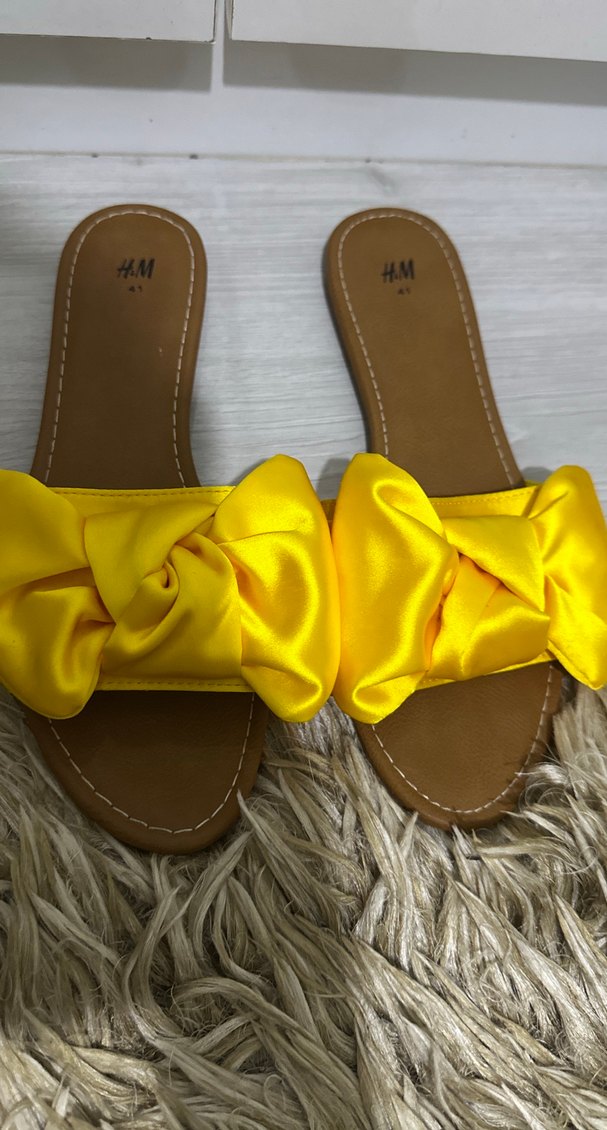 Saten kumaştan, fiyonk detaylı sarı kadın terlik. Dolgu topuklu ve rahat bohem tarzda, günlük kullanım için uygundur. Marka: H&M.