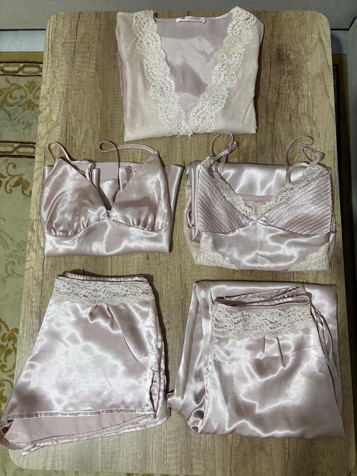 Dantel detaylı, askılı beyaz saten mini pijama takımıdır. Vintage bohem tarzını yansıtan şık ve rahat bir settir. Bir defa kullanıldı sabahlık hariç pantolonda leke mevcut buyuk ihtimal çıkar