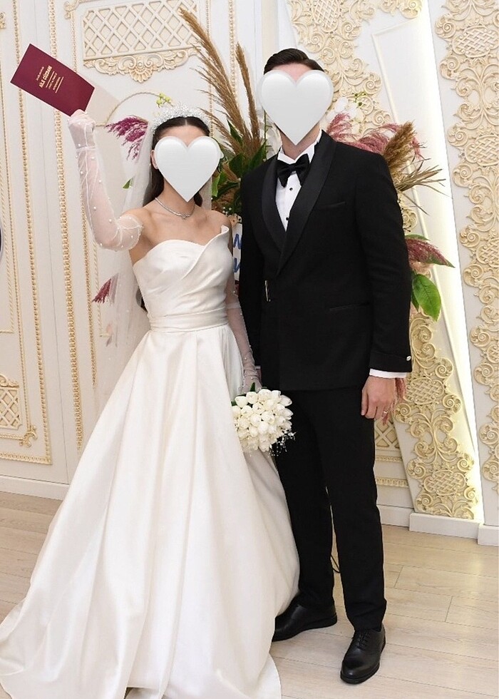 S-M bedene uygun. boyum 168- 10,5 cm topuklu ile kullandım. Defosu yok sadece nikahımda kullandım. Ziberlin kumaş straplez gelinliktir. 2m İncili Duvak, Tarlatan, 6m gelinlik ipi (sıçan kuyruğu) göndereceğim. Kuru temizlemesi yapılmıştır.