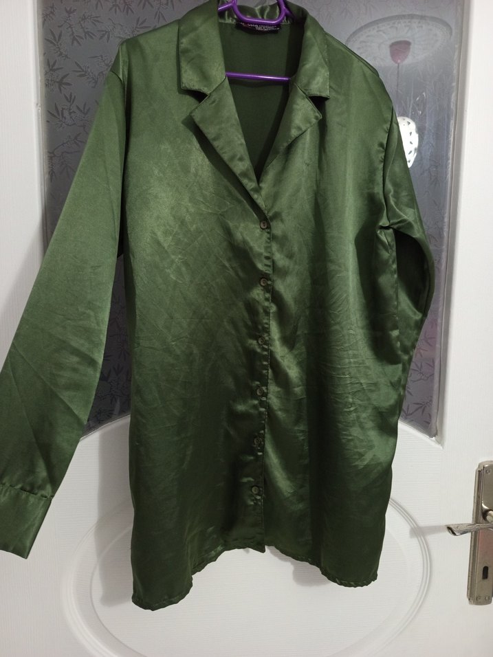 yeşil yaka detaylı saten şık gömlek