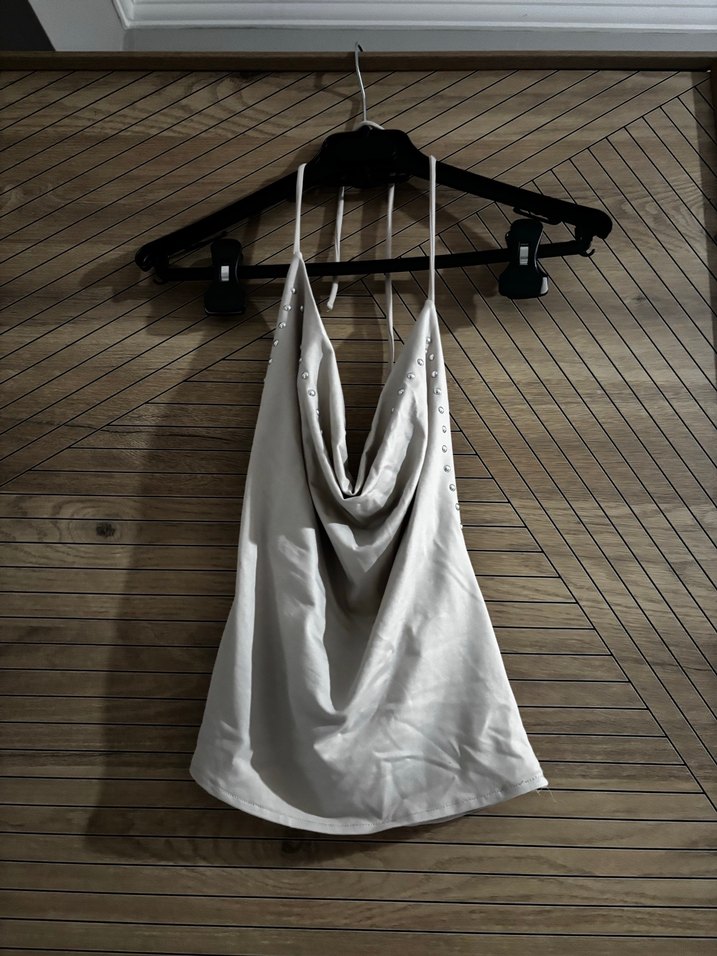Saten görünümlü kumaştan, drapeli halter yakalı, kolsuz ve normal uzunlukta beyaz bluz, minimalist sokak stili için uygundur. ✨