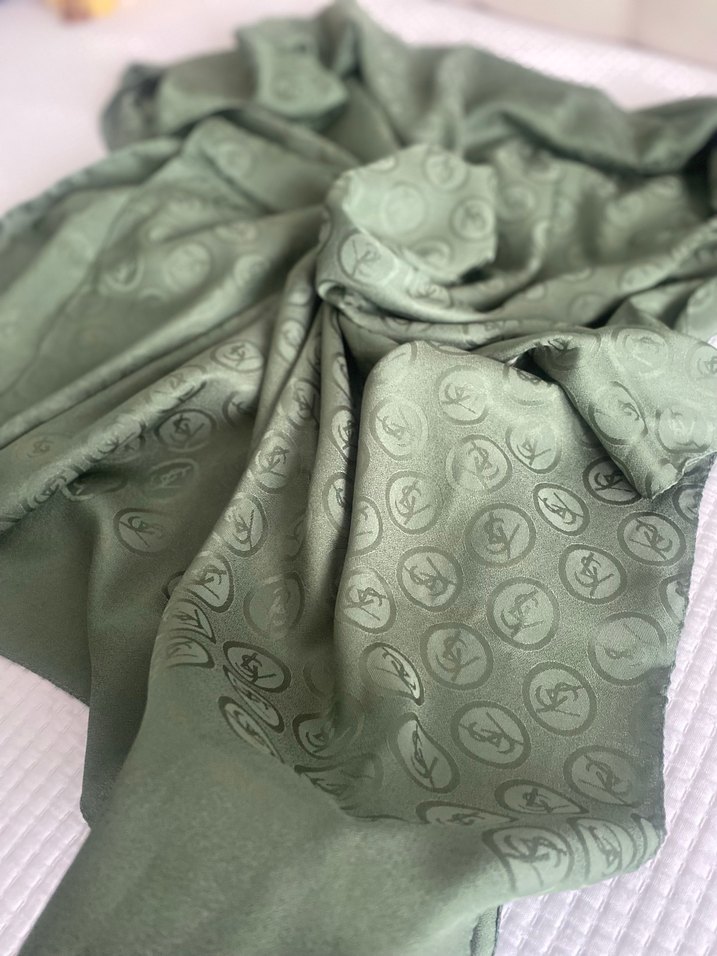 Haki renkte, saten görünümlü, drapeli kadın şal. Parlak ve desenli dokusuyla bohem ve şık tarzlara uygundur.
