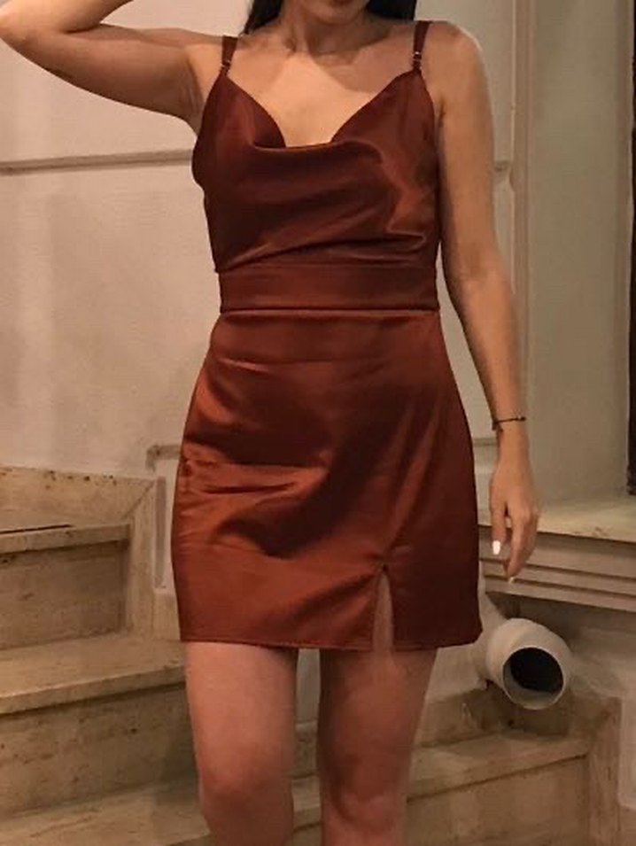 Parlak kahverengi saten görünümlü kumaştan, drapeli V yakalı ve askılı, vücuda oturan mini elbise. Cesur sokak stili ve romantik akşamlar için uygun.