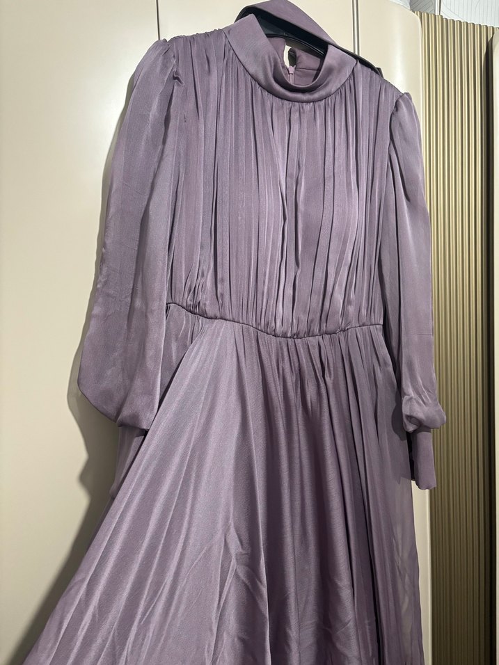 Mor renkli uzun elbise, yüksek yakalı ve uzun kolludur. Saten görünümlü kumaşı ve pilili tasarımıyla vintage ve modern klasik tarz sunar, düğünlere uygundur. Kemeri mevcut