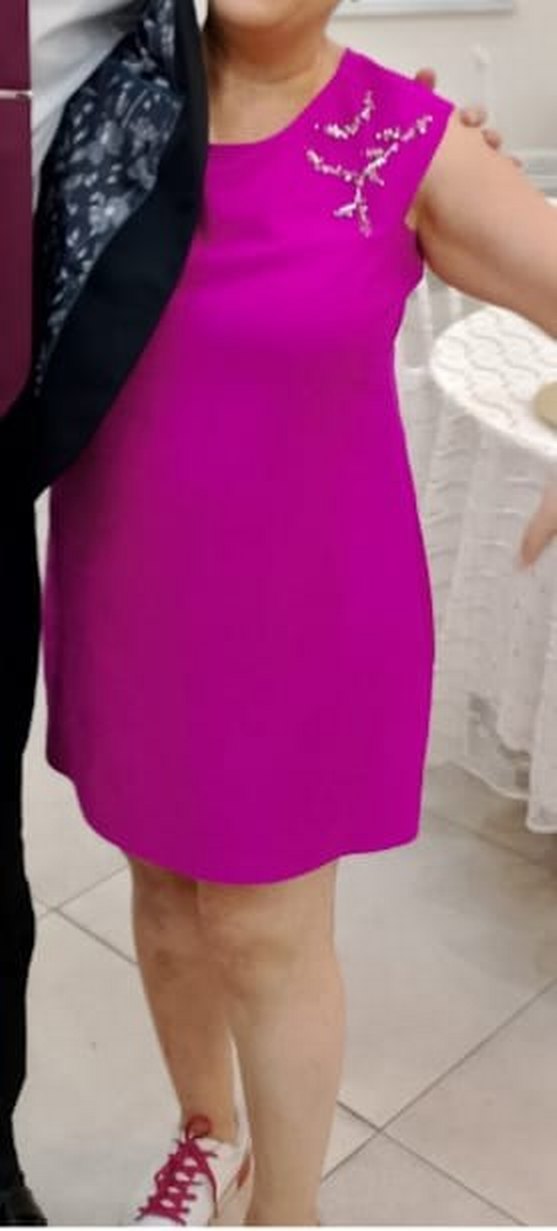 Saten görünümlü, koyu pembe renkli, v yakalı ve düğmeli mini elbise. Kolsuz ve vücuda oturan kesimiyle romantik akşamlar ve minimalist tarz için uygundur.